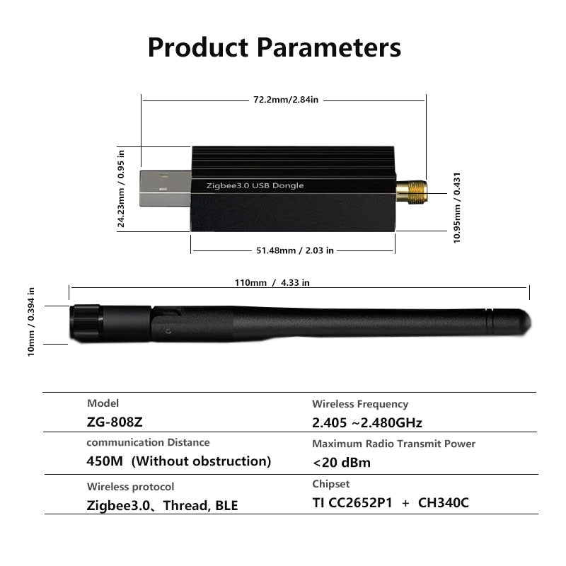The LinknLink ZG-808Z Zigbee 3.0 USB Dongle is a powerful device designed to provide seamless Zigbee 3.0 connectivity for Home Assistant users. Featuring a standard USB-A interface, it integrates a high-performance TI CC2652P1 radio, ensuring reliable communication across a wide range of Zigbee-based smart home products. Its compact design conserves USB port space on your Home Assistant gateway, eliminating the need for additional USB extensions.